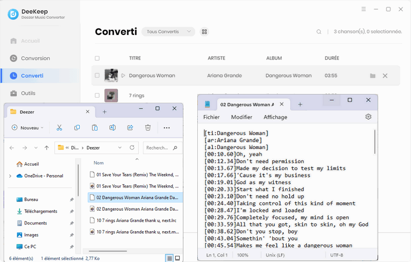 ✍ DeeKeep Deezer Music Converter est un outil qui permet de télécharger des chansons de Deezer en haute qualité et avec les paroles intégrées. Il vous permet de convertir vos chansons préférées de Deezer en différents formats audio, tout en incluant les paroles.